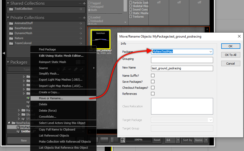 If your map is named MyTestMap1, make quintuple sure all assets are inside the folder MyTestMap1 in the Content Browser. If they are not, pieces of your map will magically vanish when you try to play it in Rocket League. This is the single most common mistake new mapmakers make.
