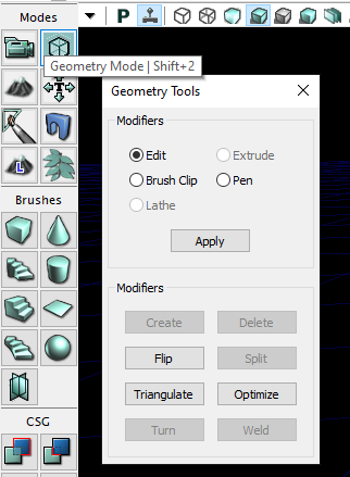 Enter Geometry Mode with this button in the top left of the UDK window (or press Shift+2). This will reveal a small Geometry Tools window with a few different modes of operation. Generally, you will only need Edit and Extrude to get the maximum utility out of this.